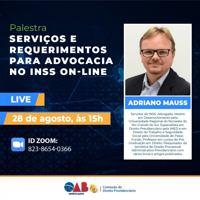 Para mais esclarecimentos, a Comissão de Direito Previdenciário convidou o Dr. Adriano Mauss, autor do livro: INSS Digital - Entenda Ponto a Ponto para apresentar uma palestra nesta sexta-feira (28/08), às 15 horas.