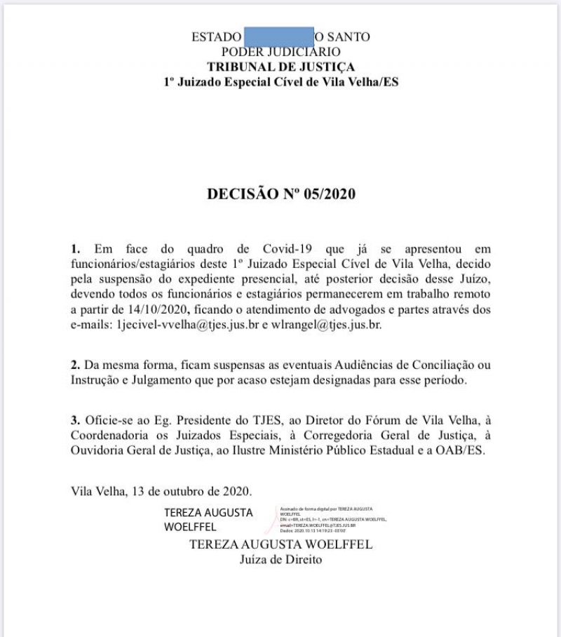 O 1º Juizado Especial Cível de Vila Velha suspendeu expediente presencial, Audiências de Conciliação ou Instrução e Julgamento. A decisão entrar em vigor a partir desta quarta-feira (14/010) e foi dada pela Juíza Tereza August Woelffel em face da pandemia do COVID-19.