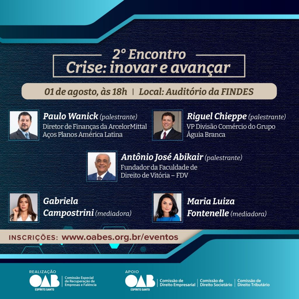 A 2ª edição do evento "Crise: Inovar e Avançar", promovido pela OAB-ES por meio das Comissões de Recuperação de Empresas e Falências, de Direito Empresarial, de Direito Societário e de Direito Tributário, reunirá grandes líderes empresariais do Espírito Santo para debater a temática, no auditório da Findes, em Vitória.