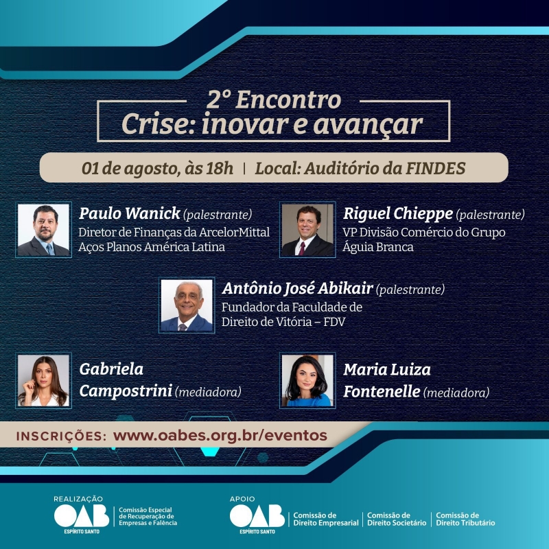 O 2° encontro da 2ª edição do evento "Crise: Inovar e Avançar", promovido pela OAB-ES por meio das Comissões de Recuperação de Empresas e Falências, de Direito Empresarial, de Direito Societário e de Direito Tributário, reunirá grandes líderes empresariais do Espírito Santo para debater a temática, no auditório da Findes, em Vitória.