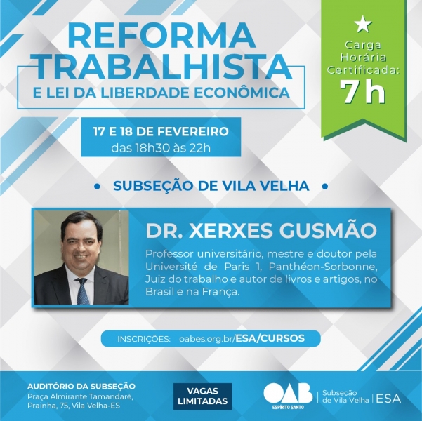 A subseção de Vila Velha vai receber o juiz do TRT, Xerxes Gusmão para abordar o tema "Reforma Trabalhista e Lei da Liberdade Econômica". O evento acontece nos próximos dias 17 e 18 de fevereiro, das 18h às 20h.