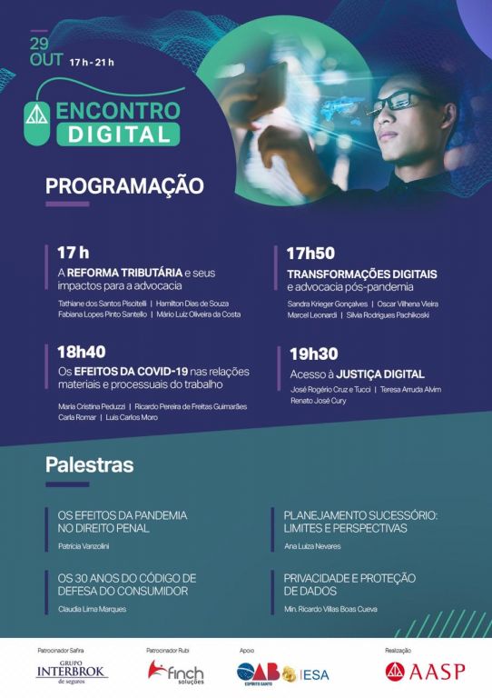 Vem aí a 1ª edição do Encontro Digital da Associação dos Advogados de São Paulo (AASP) com o apoio da OAB-ES e ESA-ES. O evento acontece na próxima quinta-feira (29/10) e vai reunir a advocacia para estimular o networking e aprimorar os conhecimentos jurídicos.