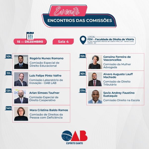 A Ordem dos Advogados do Brasil - Seccional Espírito Santo (OAB-ES), realiza, nos dias 15 e 16 de dezembro, o Encontro de Comissões com os presidentes e membros de algumas Comissões da OAB-ES. O evento é aberto ao público em geral.
