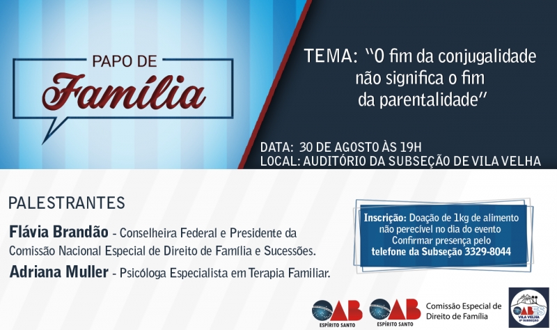 O “Papo de Família” é mais uma iniciativa da Comissão de Direito de Família da OAB-ES e em sua próxima edição vai realizar uma noite de palestras no dia 30 de agosto, no auditório da Subseção de Vila Velha, às 19h. As exposições vão abordar o tema “o fim da conjugalidade não significa o fim da parentabilidade".