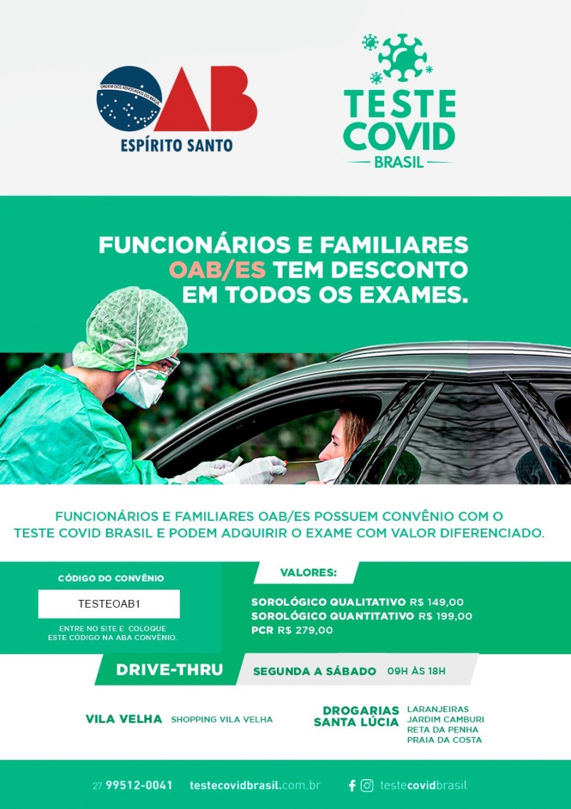 Visando garantir a segurança dos colaboradores da OAB-ES, a Seccional firmou um convênio com a Teste Covid Brasil, onde os advogados, os funcionários e seus familiares poderão realizar, com desconto, exames laboratoriais que possam detectar ou não a existência da Covid-19.
