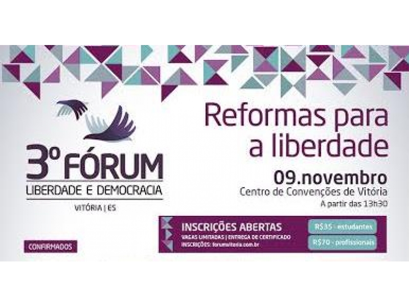 Os advogados inscritos na OAB-ES terão 50% de desconto para participar do III Fórum Liberdade e Democracia de Vitória: reformas pela Liberdade, no próximo dia 09, às 13h30, no Centro de Convenções de Vitória. O evento é realizado pelo Instituto Líderes do Amanhã com apoio da Seccional.