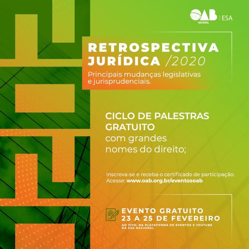 O presidente da ESA-ES, Alexandre Zamprogno, foi convidado para participar da webinar "Retrospectiva Jurídica 2020: principais mudanças legislativas e jurisprudenciais" da ESA Nacional, que será realizada nos dias 23, 24 e 25 de fevereiro.