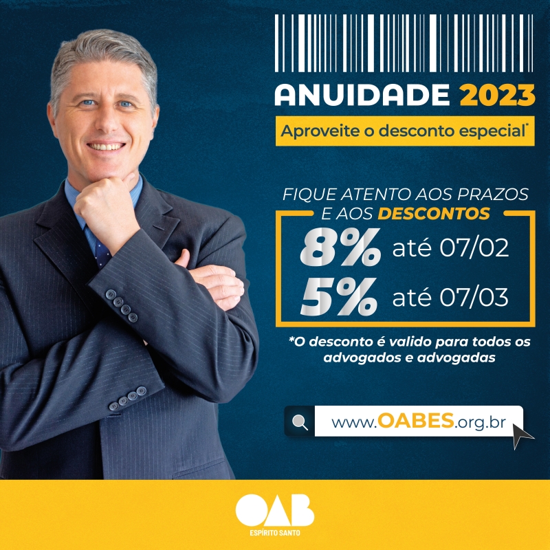 O desconto do pagamento da Anuidade 2023 é válido para todas as advogadas e os advogados inscritos na Ordem.