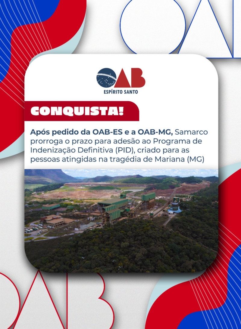 Após a OAB-ES e a OAB-MG solicitarem à Samarco Mineração, entre os principais pontos de providências, a prorrogação do prazo para a adesão ao Programa indenizatório Definitivo (PID), a empresa anunciou nesta terça, 27, a extensão da data para 04 de julho.
