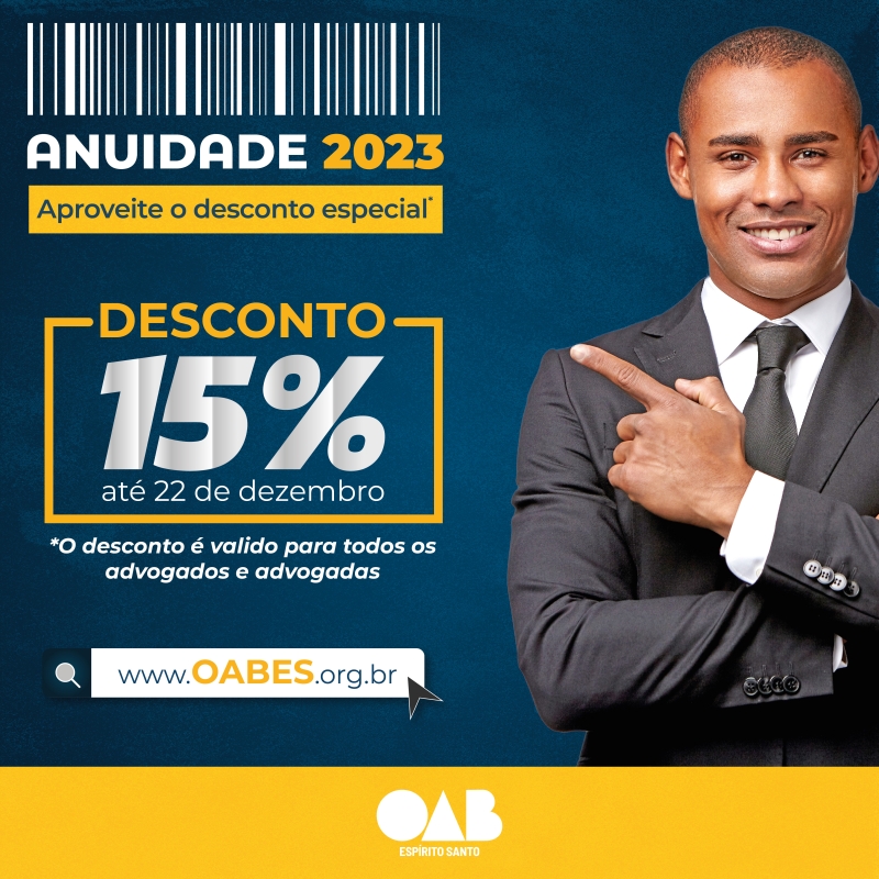 Além disso, o pagamento da anuidade de 2023 traz um diferencial. “O desconto é válido para todas as advogadas e os advogados inscritos na Ordem", informa o tesoureiro da OAB-ES, Anderson Ferreira Felis.