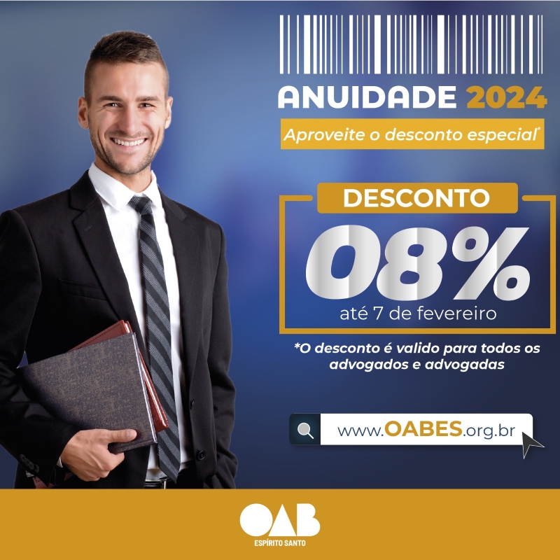 A Ordem dos Advogados do Brasil - Seccional Espírito Santo (OAB-ES) vai oferecer aos advogados e advogadas o desconto de 8% na anuidade para pagamento em parcela única, até o próximo dia 7 de fevereiro de 2024.