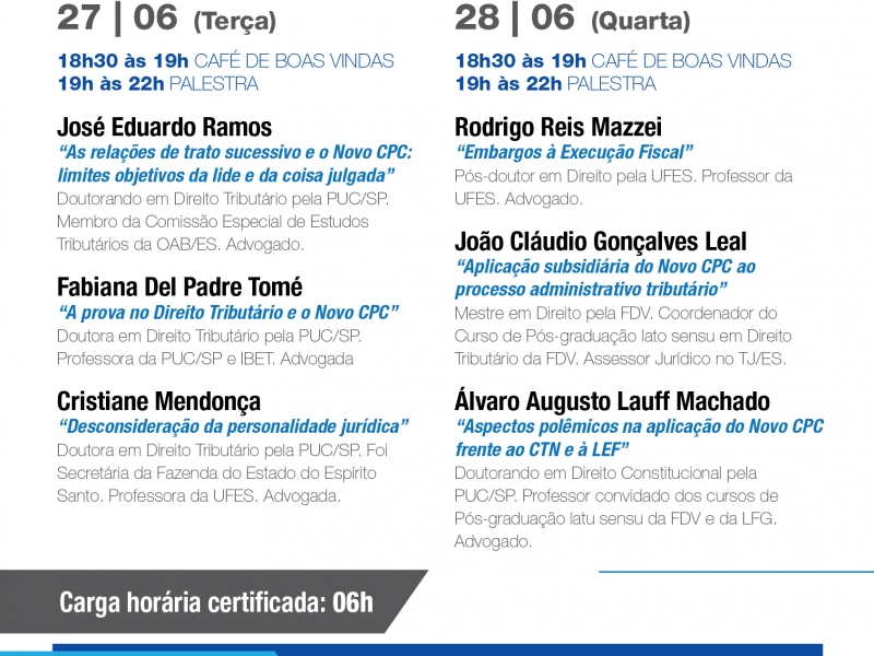 Ainda dá tempo de participar. Últimas vagas disponíveis para o curso sobre as implicações da edição do novo CPC nas discussões que envolvem a matéria tributária, nesta terça (27) e quarta-feira (28), no auditório da OAB-ES. As temáticas oferecidas são de natureza processual sobre as regras de atuação do advogado na justiça. FAÇA SUA INSCRIÇÃO ONLINE