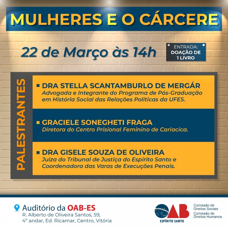 Com a participação das Comissões de Direitos Sociais e da Mulher Advogada, o evento terá as palestras da diretoria do Centro Prisional Feminino de Cariacica, Graciele Sonegheti, da advogada e estudiosa de história social das relações políticas e da juíza, coordenador das varas de execuções penais, Gisele Souza de Oliveira.