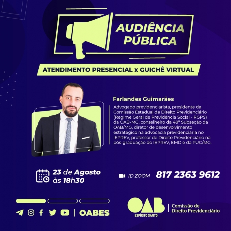 A audiência pública “Atendimento Presencial X Guichê Virtual” acontece na nesta segunda-feira (23/08), às 18h30. O evento está sendo promovido pela OAB-ES, por meio por meio da Comissão de Direito Previdenciário. A audiência pública será on-line e transmitida via Zoom.