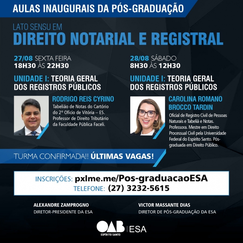 As aulas inaugurais do curso de Direito Notarial e Registral da ESA-ES serão realizadas nesta sexta-feira (27/08) e sábado (28/08), com o tema “ Teoria Geral dos Registros Públicos”.