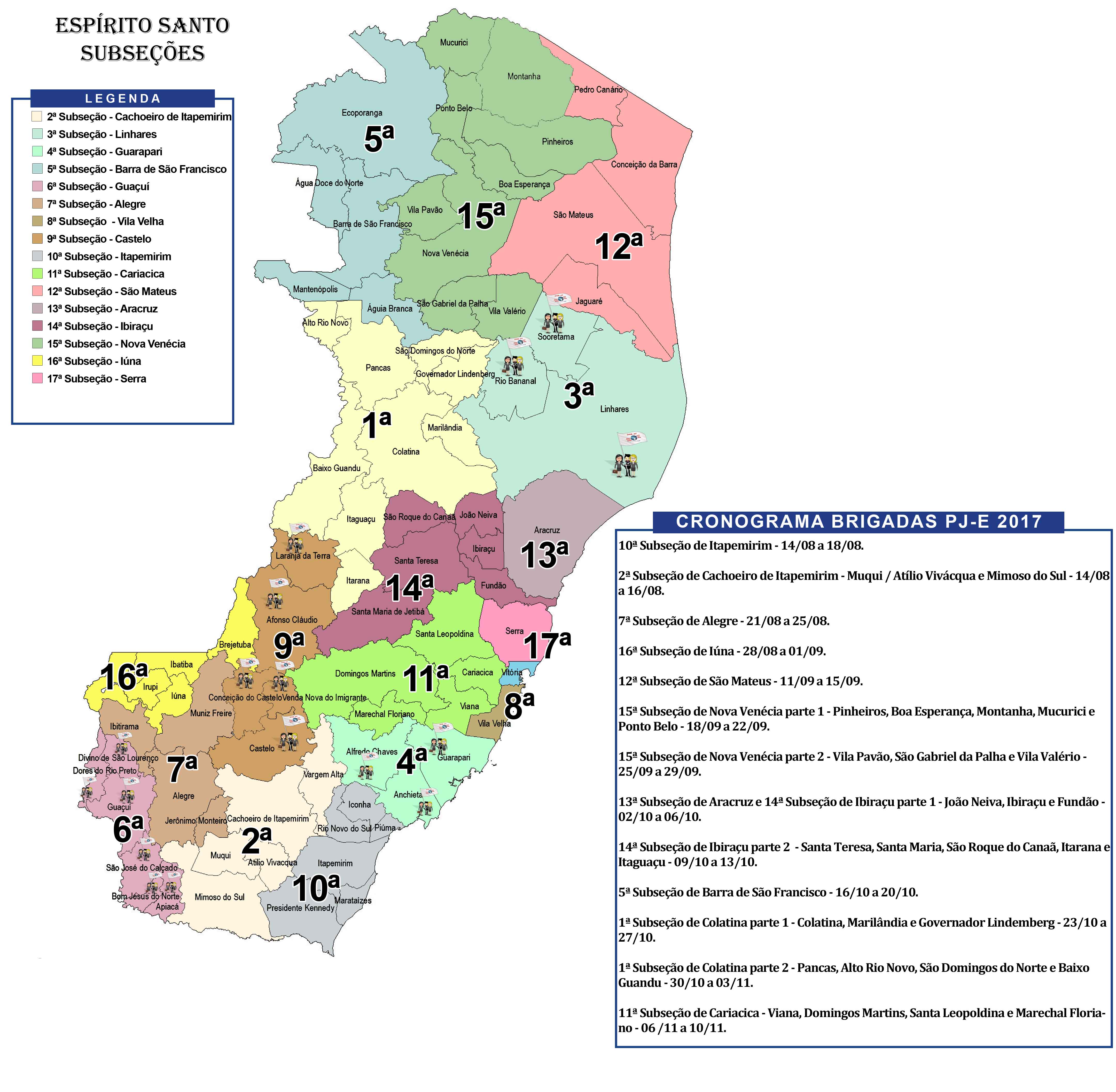 CronogramaAs Brigadas PJe seguem até a primeira semana de novembro. Serão percorridos todos os 78 municípios do Estados, divididos pelas 17 subseções da Ordem. Veja o cronograma completo do projeto. Clique para ampliar.