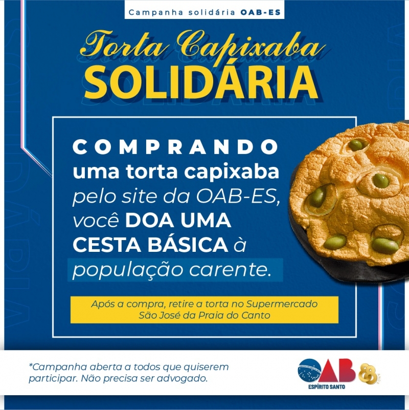 Basta participar da campanha “Torta Solidária” da OAB-,ES que está arrecadando cestas básicas para a população carente. Os interessados só precisarão a torta pelo site da OAB-ES através do link http://tortacapixaba.oabes.org.br/ , no valor de R$100,00.
