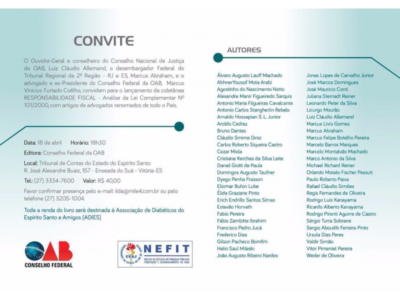 O ouvidor-geral e conselheiro do Conselho Nacional de Justiça da OAB, Luiz Cláudio Allemand, o desembargador federal do Tribunal Regional da 2ª Região - RJ e ES, Marcus Abraham, e o advogado e ex-presidente do Conselho Federal da OAB, Marcus Vinícius Furtado Coêlho, convidam para o lançamento da coletânea Responsabilidade Fiscal – Análise da Lei Complementar N° 101/2000, com artigos de advogados renomados de todo o país.