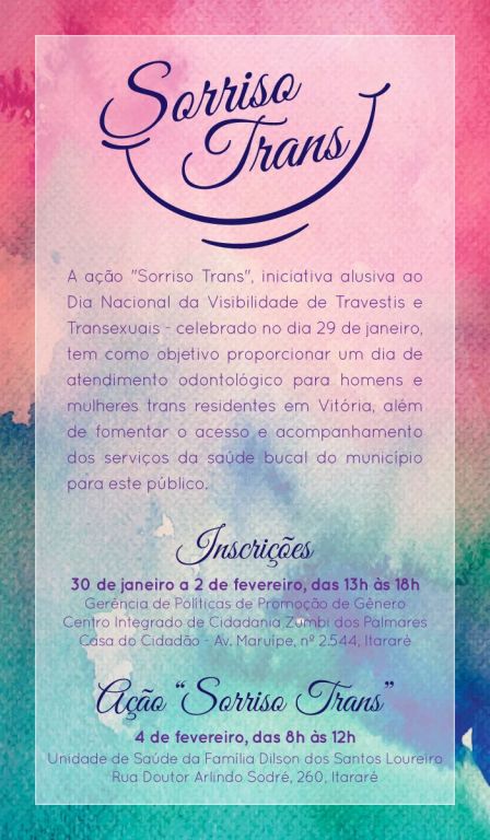 A Ordem dos Advogados do Brasil – Seção Espírito Santo (OAB-ES), por meio da Comissão da Diversidade Sexual, apoia a ação “Sorriso Trans”, organizada pela Prefeitura Municipal de Vitória em alusão ao dia Nacional de Visibilidade de Travestis e Transexuais. Na próxima sexta-feira (04), trans residentes de Vitória receberão atendimento odontológico gratuito. Veja mais informações abaixo.