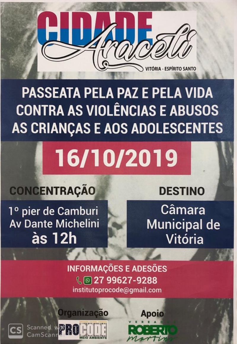 No dia 16 de outubro será realizada uma passeata pela paz e pela vida em Vitória, para chamar atenção da sociedade para violências e abusos contra crianças e adolescentes, em homenagem a Araceli Cabrera Sanchez Crespo, que foi brutalmente assassinada no ano de 1973. A comissão, na representação de seu presidente Raphael Câmara, se fará presente.
