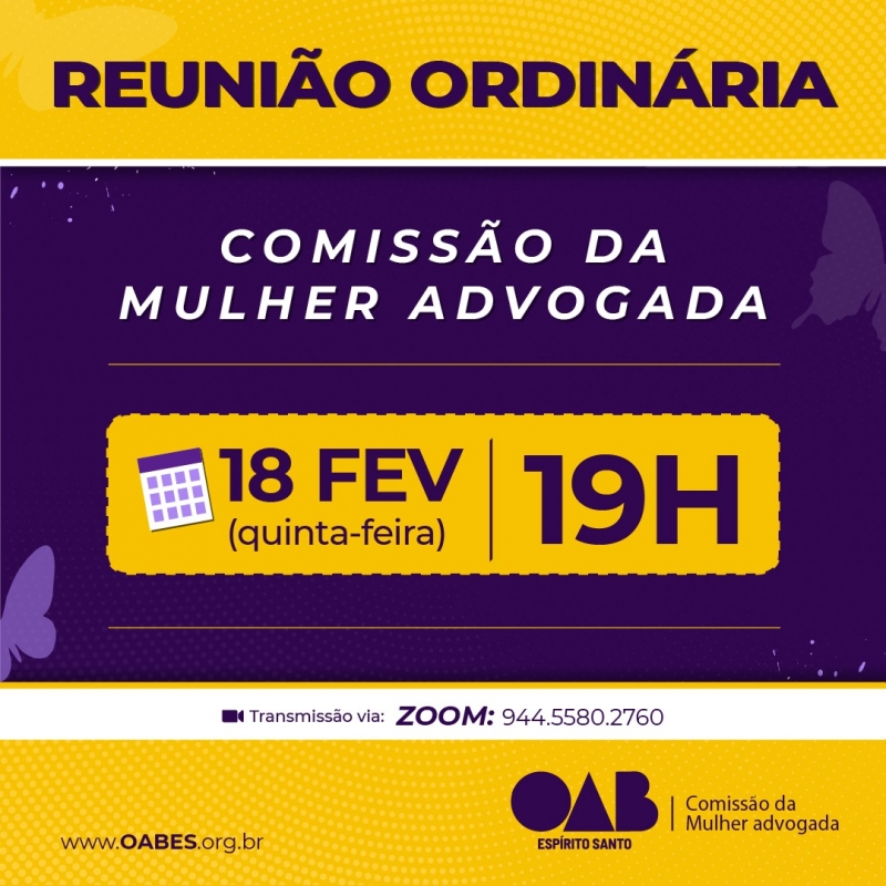 A Comissão da Mulher Advogada da OAB-ES reinicia os trabalhos nesta quinta-feira (18/02). A 1ª reunião de 2021 será on-line e está marcada para às 19 horas com a presença da nova presidente da Comissão, Anabela Galvão, que também é vice-presidente da OAB-ES.
