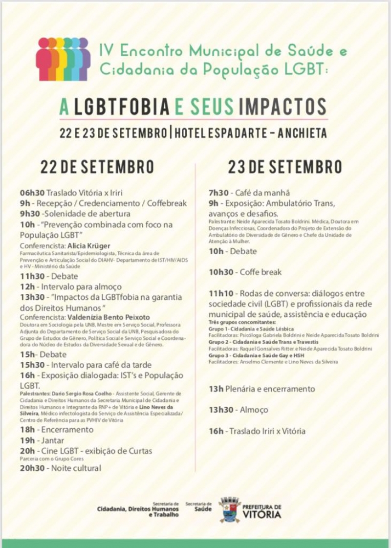 O evento, realizado pela Prefeitura de Vitória, também teve exibição de filmes com temática LGBT, debates, exposição e roda de conversas. O presidente da Comissão de Diversidade Sexual da OAB-ES, Luiz Guilherme Vello, disse que o evento foi importante na definição de políticas públicas de atendimento nos postos de saúde à comunidade LGBT. Também foi apontada a necessidade de capacitação e formação continuada dos agentes de saúde.