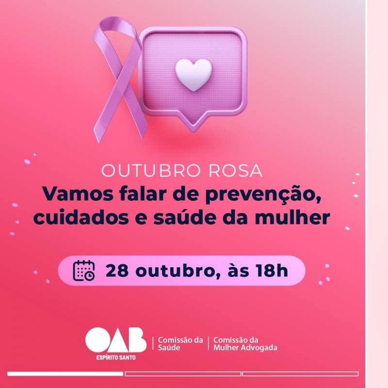 A saúde da mulher é um tema bastante debatido ao longo deste mês, principalmente, devido às ações da campanha do Outubro Rosa, que envolvem a prevenção ao câncer de mama. E, pensando nisso, a Ordem dos Advogados do Brasil - Seccional Espírito Santo (OAB-ES) promoverá, no dia 28, às 18h, um trabalho ao lado da Comissão da Saúde e da Comissão da Mulher Advogada.