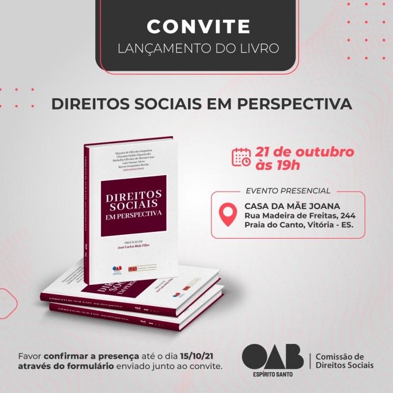 Ao longo dos últimos três anos, diversos temas foram abordados e debatidos pela Comissão de Direitos Sociais da Ordem dos Advogados do Brasil - Seccional Espírito Santo (OAB-ES). E a partir de agora, todos esses assuntos poderão ser apreciados no livro “Direitos sociais em Perspectiva”. O lançamento será na quinta-feira (21/10), às 19h, na Casa da Mãe Joana Lounge, que fica na Rua Madeira de Freitas, 244, Praia do Canto, Vitória. O evento, presencial, estará de acordo com todas as normas sanitárias.