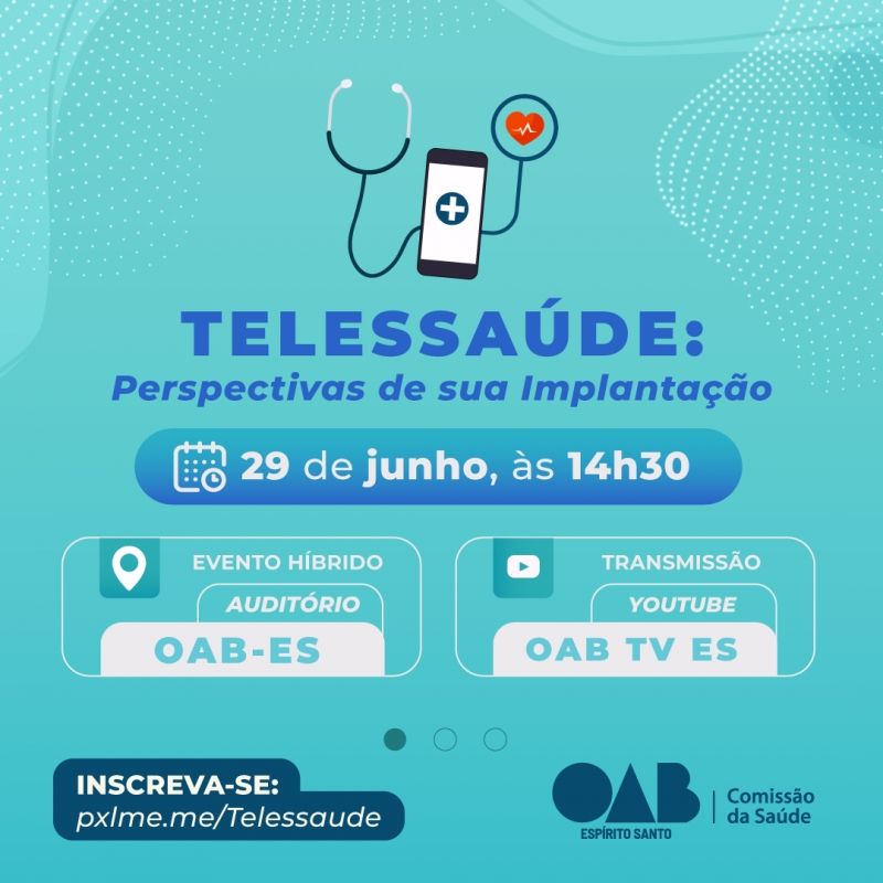 A Comissão da Saúde da Ordem dos Advogados do Brasil, Seccional Espírito Santo (OAB-ES) realizará o evento “Telessaúde: Perspectivas de sua Implantação”, que ocorrerá no dia 29 de junho, das 14h30 às 18h00. As palestras serão no auditório da Seccional, com transmissão pelo canal do YouTube da OAB-TV.