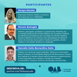 O encontro tem como objetivo abordar e disseminar o conhecimento de toda a temática da Telessaúde (Telemedicina) sob os aspectos legislativos e seus impactos legais, de acordo com a ótica da Lei Geral de Proteção de Dados Pessoais (LGPD). Além disso, o cunho educacional e de formação profissional, bem como a melhoria de acesso com redução de custos também serão temas debatidos.