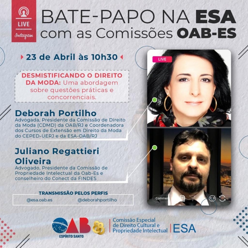 A transmissão acontecerá às 10h30 e será transmitida pelos perfis @esa.oab.es e @deborahportilho.
