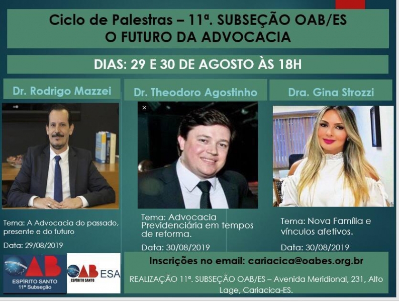 Em comemoração ao mês da Advocacia, a Comissão de Eventos, Esporte e Lazer, a Comissão da Mulher e a Comissão da Mulher Advogada da 11° Subseção da OAB/ES convida a todos para participarem do ciclo de palestras.