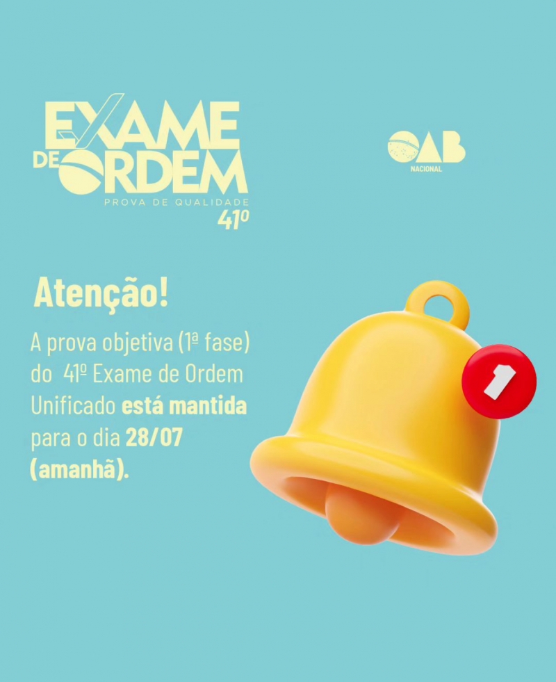 O Conselho Federal da Ordem dos Advogados do Brasil, a Coordenação Nacional de Exame de Ordem Unificado e a Comissão Nacional de Exame de Ordem, informam aos examinandos inscritos no 41° Exame de Ordem Unificado que a prova objetiva (1ª fase) prevista para amanhã, dia 28 de julho, será mantida respeitando-se todas as proporções do País.