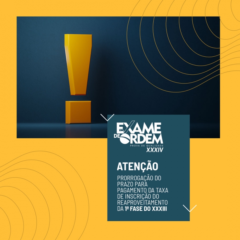 A Coordenação Nacional do Exame de Ordem Unificado comunica a prorrogação do prazo para pagamento da taxa de inscrição do reaproveitamento da 1ª fase do XXXIII Exame de Ordem Unificado.
