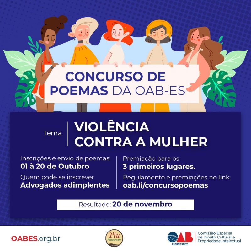 A Comissão Especial de Direito Cultura e Propriedade Intelectual da OAB-ES está promovendo um concurso de poemas sobre “Violência contra a mulher”.