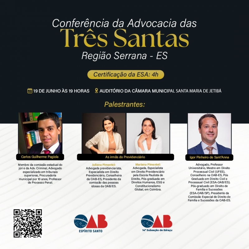 A Seccional da OAB-ES, em parceria com a 14ª Subseção de Ibiraçu, promoverá a Conferência da Advocacia das Três Santas no dia 19 de junho (quarta-feira), no auditório da Câmara Municipal de Santa Maria de Jetibá.