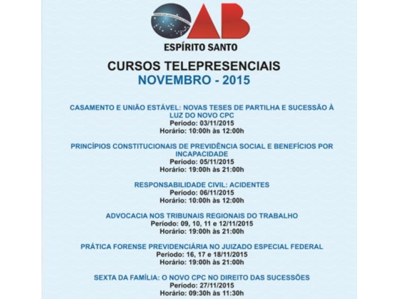 Os interessados em participar dos cursos telepresenciais de novembro podem visualizar toda a agenda no site da Escola Superior de Advocacia, que divulga com antecedência os temas e horários para que os advogados ou estudantes consigam se programar. As inscrições são feitas online a um valor bem acessível. Em novembro serão ministradas seis aulas com a coordenação da Associação dos Advogados de São Paulo (AASP).