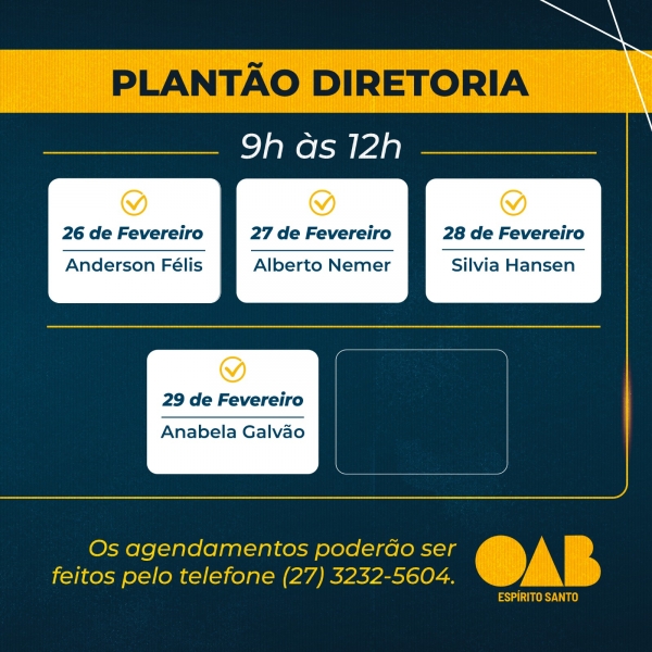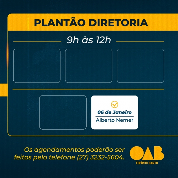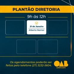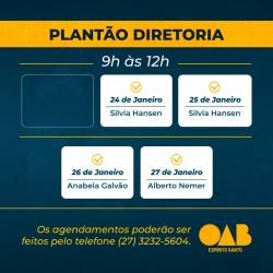 A OAB-ES divulgou os horários do plantão da sua Diretoria para atendimento exclusivo para a advocacia capixaba neste mês de fevereiro.