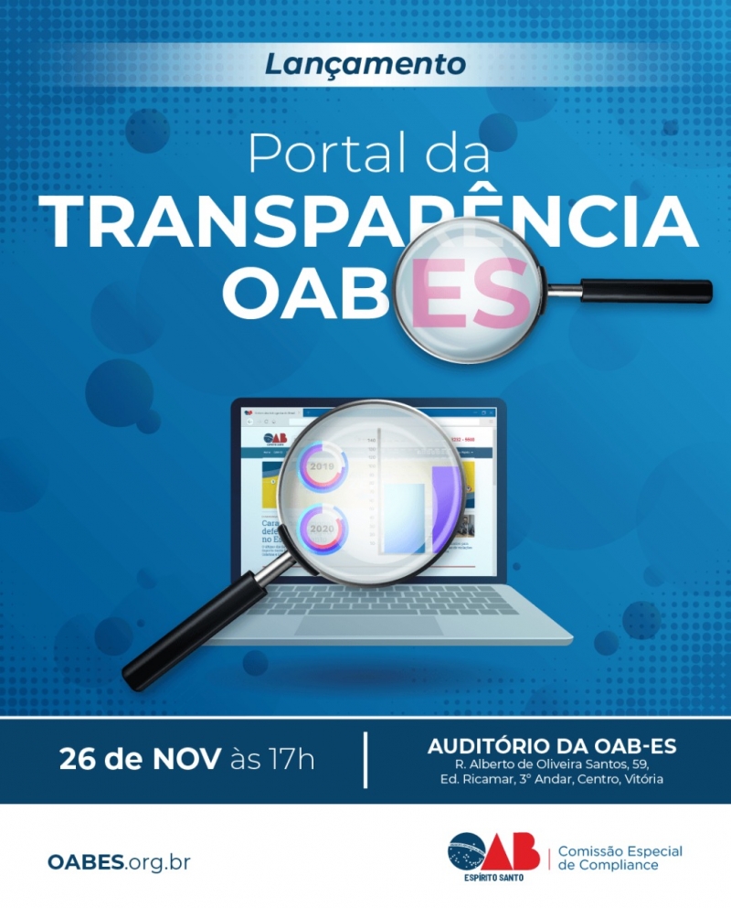 Cumprindo o compromisso de garantir e ampliar a transparência da atual gestão, a OAB-ES lança, no próximo dia 26 de novembro, o seu Portal de Transparência. Com a nova ferramenta, os advogados e toda a Sociedade poderão acompanhar informações sobre as contas e as demonstrações contábeis e financeiras da seccional e subseções. O novo portal também traz informações completas de toda estrutura organizacional da OAB/ES.