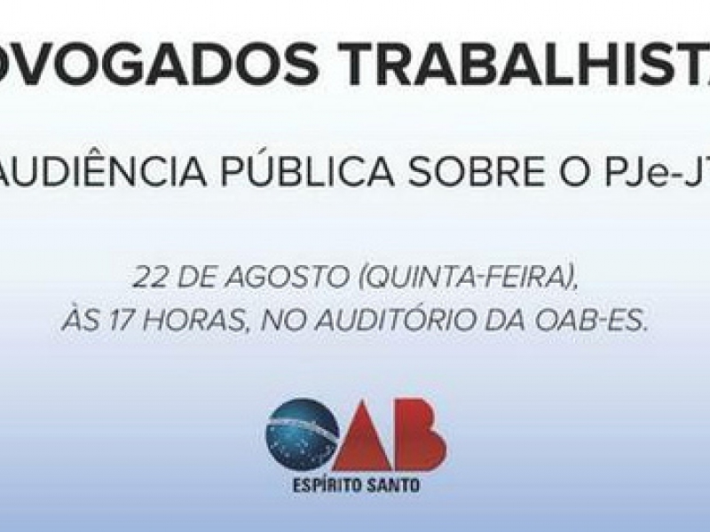 A Ordem dos Advogados do Brasil – Seção do Espírito Santo (OAB-ES) convida os advogados que militam na Justiça Trabalhista para uma Audiência Pública que será realizada nesta quinta-feira (22), às 17 horas, no Auditório da Seccional. O assunto em pauta é a implantação do Processo Judicial Eletrônico no âmbito do Tribunal Regional do Trabalho da 17ª Região (TRT-ES).