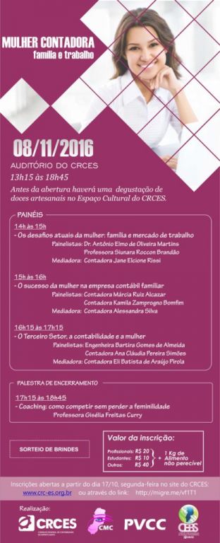 O Conselho Regional de Contabilidade do Espírito Santo (CRCES) convida as advogadas, por meio da Ordem dos Advogados do Brasil - Seção Espírito Santo (OAB-ES), para o Workshop Mulher Contadora: Família e Trabalho, a ser realizado em 08 de novembro.