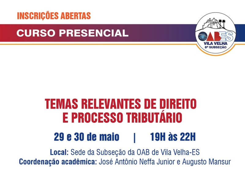 A Escola Superior de Advocacia da Ordem dos Advogados do Brasil – Seção Espírito Santo (ESA/OAB-ES), convida advogados e advogadas inscritos na Ordem e demais interessados para o curso “Temas Relevantes de Direito e Processo Tributário”.