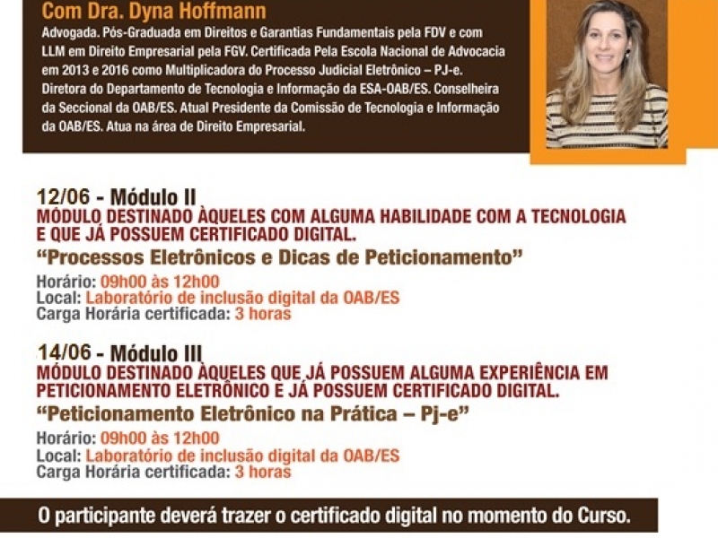 O curso de Peticionamento Eletrônico realizado pela ESA/OAB-ES e ministrado pela presidente da Comissão de Tecnologia e Informação da Seccional, Dyna Hoffmann, está com inscrições abertas em novos módulos que vão acontecer nos próximos dias 12 e 14. As aulas são segmentadas por habilidade para que os advogados consigam alcançar maior aproveitamento. INSCREVA-SE