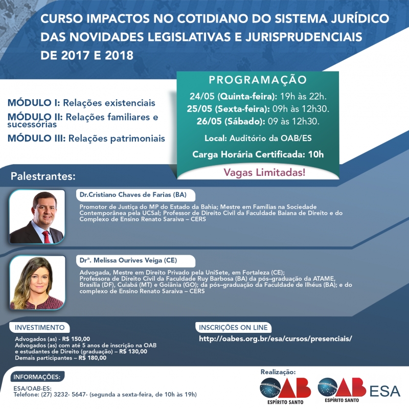 A Escola Superior de Advocacia (ESA) da Ordem dos Advogados do Brasil - Seção Espírito Santo (OAB-ES) promove, nos dias 24, 25 e 26 de maio, o curso "Impactos no Cotidiano do Sistema Jurídico das Novidades Legislativas e Jurisprudenciais de 2017 e 2018".
