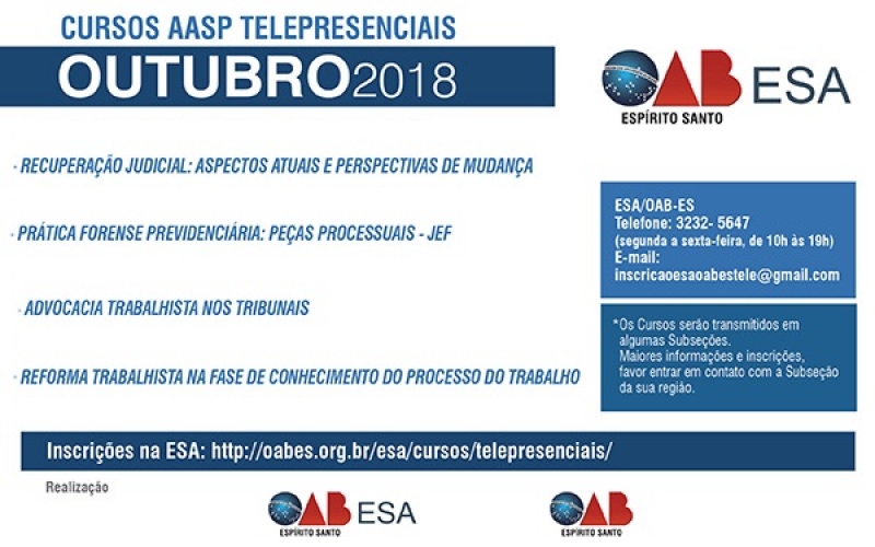 Estão abertas as inscrições para os cursos AASP telepresenciais para a segunda quinzena de outubro 2018 retransmitidos pela ESA/OAB-ES. Os advogados poderão se aprofundar nos estudos sobre Recuperação Judicial: Aspectos Atuais e Perspectivas de Mudança; Prática Forense Previdenciária: Peças Processuais – JEF; Advocacia Trabalhista nos Tribunais e Reforma Trabalhista na Fase de Conhecimento do Processo do Trabalho.