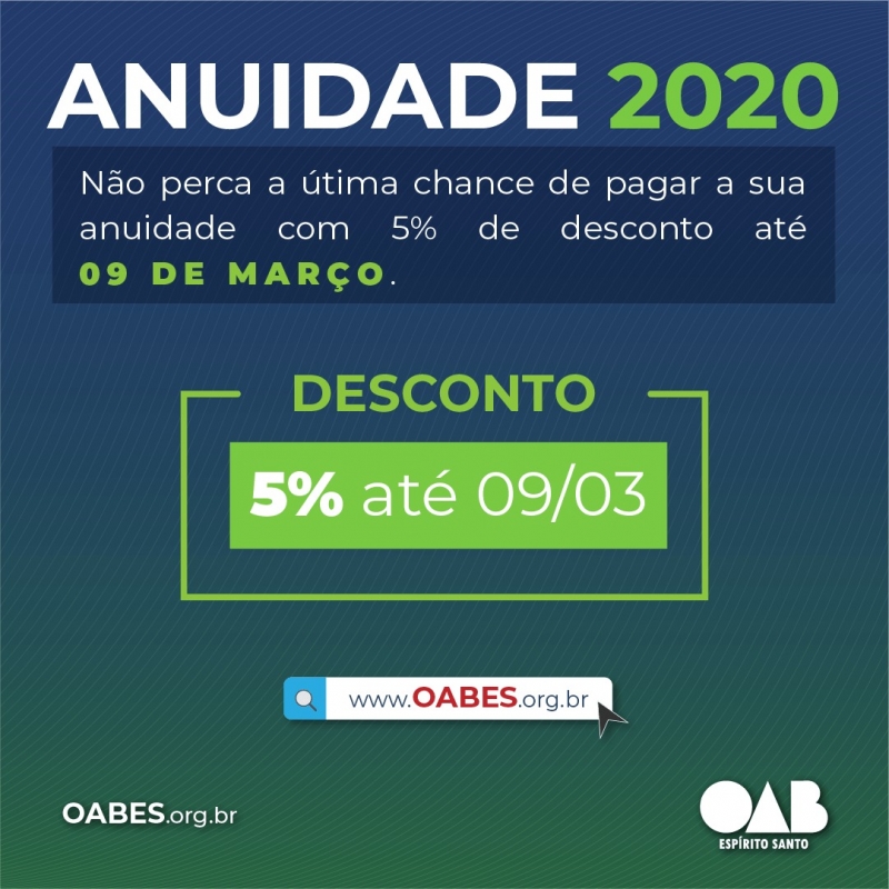 É importante lembrar que a OAB-ES - para cortar gastos desnecessários e atender às preocupações ecológicas - deixou de imprimir e enviar aos advogados os tradicionais carnês de anuidade. O pagamento só pode ser realizado pelo site da entidade, no link http://www.oabes.org.br/servicos/anuidade/