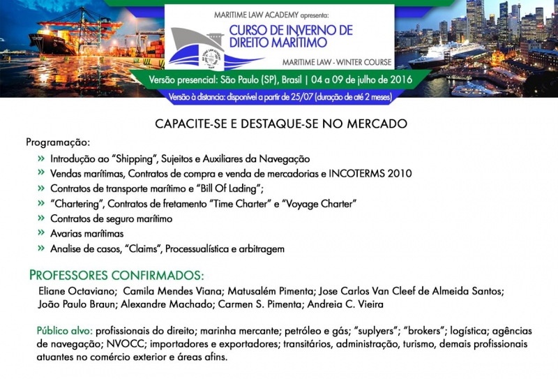 Para mais informações entre em contato diretamente com a realizadora do curso pelo telefone (11) 98208-3672 ou pelo e-mail mlaw@maritimelawacademy.com.