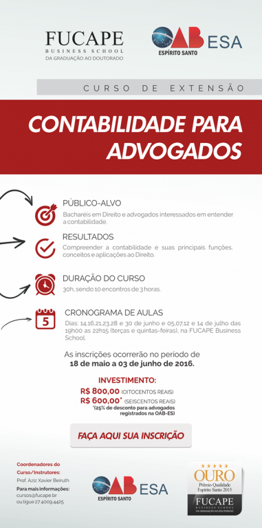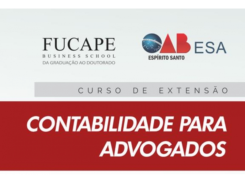Os advogados regularmente inscritos na OAB-ES terão um desconto especial no curso de extensão sobre contabilidade para advogados, por meio da parceria entre a ESA/OAB-ES e a faculdade Fucape. As aulas serão realizadas de 14 de junho a 14 de julho em dias alternados, conforme a programação abaixo. As inscrições devem ser feitas até o próximo dia 03. FAÇA SUA INSCRIÇÃO ONLINE