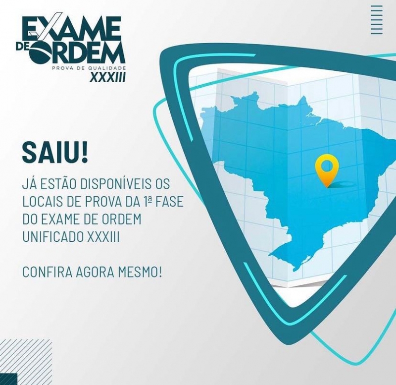 A OAB Nacional, por meio da Coordenação Nacional do Exame de Ordem Unificado, divulgou, nesta segunda-feira (11), os locais da prova do XXXIII Exame de Ordem Unificado (EOU). O exame será aplicado no próximo domingo, dia 17 de outubro de 2021, das 13h às 18h. Os portões serão abertos às 11h30 e fechados pontualmente às 12h30, sempre observado o horário oficial de Brasília.
