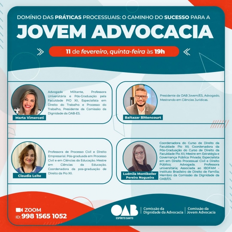 Estarão presentes na live, o presidente da Comissão da Jovem Advocacia, Baltazar Bittencourt; a presidente da Comissão da Dignidade da Advocacia, Marta Vimercati; a coordenadora de pós-graduação em Direito da Pio XII, Claudia Leite; e a integrante da Comissão da Dignidade da OAB-ES, Ludmila Montibeller Pereira Nogueira.